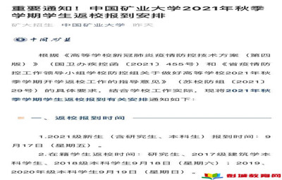 徐州教育:結(jié)合疫情防控實(shí)際情況,一批江蘇高校公布了2021年秋季學(xué)期學(xué)生返校報(bào)到時(shí)間!一起來看看你的學(xué)校啥時(shí)候返校!大一新生們也可以做好準(zhǔn)備啦~中國礦業(yè)大學(xué)2021級新生(含研究生、本科生