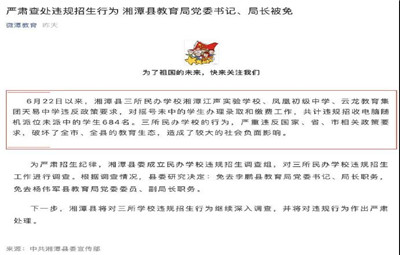 彭城教育:7月26日,據(jù)中共湘潭縣委宣傳部消息,因湘潭縣三所民辦學(xué)校湘潭江聲實驗學(xué)校、鳳凰初級中學(xué)、云龍教育集團(tuán)天易中學(xué)違反政策要求,對搖號未中的學(xué)生辦理錄取和繳費工作,共計違規(guī)招