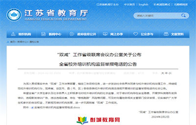 彭城教育:2月2日,江蘇省教育廳發(fā)布《“雙減”工作省級(jí)聯(lián)席會(huì)議辦公室關(guān)于公布全省校外培訓(xùn)機(jī)構(gòu)監(jiān)督舉報(bào)電話的公告》。