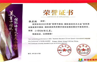 喜報:黃山中心小學(xué)張啟炫同學(xué)在2023年度“美育中國說”全國英語演講比賽中榮獲小學(xué)組銀之星