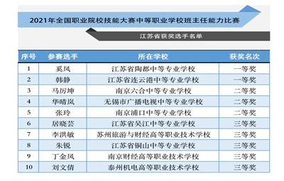 徐州教育:日前,教育部公布了2021年全國職業(yè)院校技能大賽中等職業(yè)學(xué)校班主任能力比賽獲獎選手名單。江蘇省共有2位參賽老師榮獲一等獎、3位參賽老師榮獲二等獎和5位參賽老師榮獲三等獎。