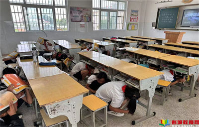 彭城教育:上午十點,"嗚嗚、嗚嗚……"急促的警報聲響徹校園,聽到"地震",班主任立即告知學(xué)生"地震來了,不要慌,趕快躲避",學(xué)生們躲在課桌下,雙手抱頭。1分鐘后應(yīng)急疏散警報響起,各班學(xué)生