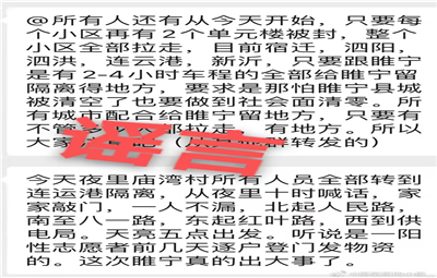 徐州教育:近日,“只要每個小區(qū)再有2個單元被封,整個小區(qū)全部拉走”“外環(huán)以內(nèi)要拉空”“哪怕睢寧縣城被清空了也要做到社會面清零”“就是為26號清零做準備的”等多個傳言信息在微信群內(nèi)傳