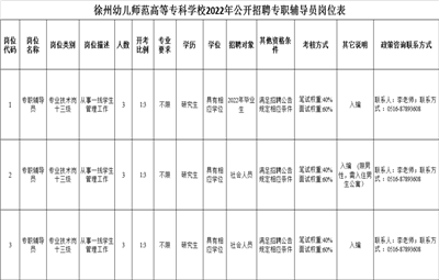 徐州教育:根據(jù)《江蘇省事業(yè)單位公開招聘人員辦法》(蘇辦發(fā)〔2020〕9號)精神,為加強學(xué)校輔導(dǎo)員隊伍建設(shè),優(yōu)化人員結(jié)構(gòu),徐州幼兒師范高等??茖W(xué)校決定面向社會公開招聘專職輔導(dǎo)員9名?,F(xiàn)將