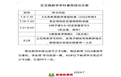 彭城教育:書香校園,師者先行。為促進(jìn)教師更好地學(xué)習(xí)新教育理念和實(shí)施方法,促進(jìn)教師思考并優(yōu)化現(xiàn)代化教學(xué)行為,暑假期間,漢王實(shí)驗(yàn)小學(xué)組織數(shù)學(xué)老師進(jìn)行數(shù)學(xué)名著和專家課的學(xué)習(xí)。安排如下