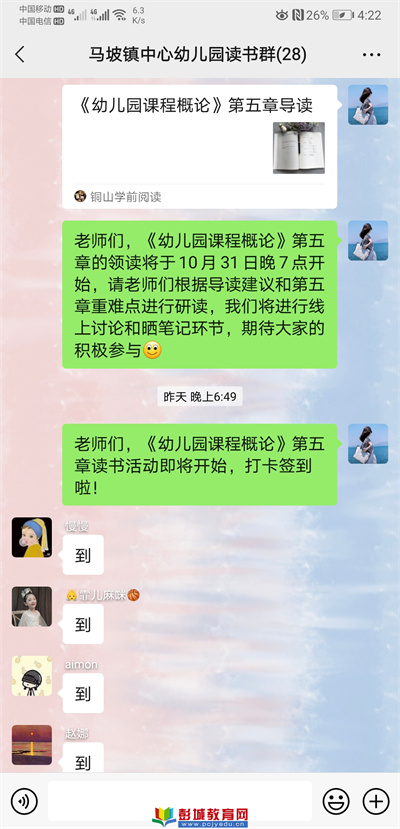 徐州教育:隨著一句“親愛的老師們,我們就開始打卡啦”,在馬佳慧老師的組織下我們的《幼兒園課程概論》第五章跟讀活動(dòng)開始了?;顒?dòng)開始前,馬老師分享了一篇關(guān)于虞永平教授解讀園本課程的