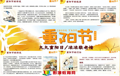 彭城教育:重陽(yáng)節(jié),為每年的農(nóng)歷九月初九日,是中國(guó)傳統(tǒng)節(jié)日。重陽(yáng)節(jié)又叫“老人節(jié)”,尊老、敬老是中華民族的傳統(tǒng)美德。慶祝重陽(yáng)節(jié)一般包括出游賞景、登高遠(yuǎn)眺、觀賞菊花、遍插茱萸、吃重陽(yáng)
