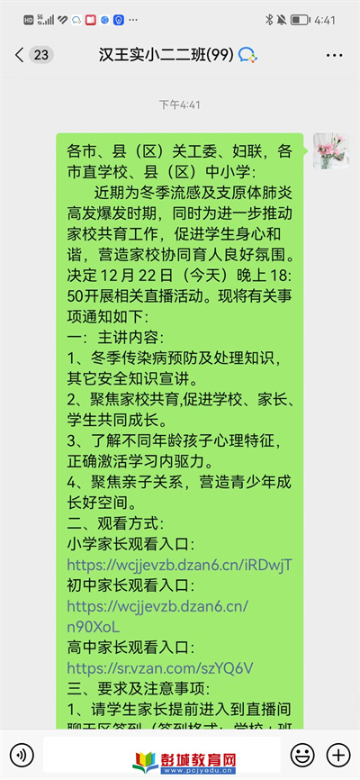 教育熱點(diǎn):近期為冬季流感及支原體肺炎高發(fā)爆發(fā)時(shí)期,同時(shí)為進(jìn)一步推動家校共育工作,促進(jìn)學(xué)生身心和諧,營造家校協(xié)同育人良好氛圍。12月22日,漢王實(shí)驗(yàn)小學(xué)組織全體家長觀看家庭教育公益直播