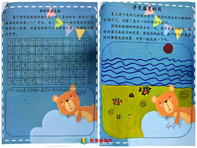 彭城教育:夏日茵茵,蟬聲鳴鳴,為豐富孩子的暑假生活,讓他們過一個有意義、有書香氣的暑假,碧水灣小學語文教師們精心設計了特色暑假作業(yè)。下面一起來欣賞孩子們的暑期成果吧!二年級二年