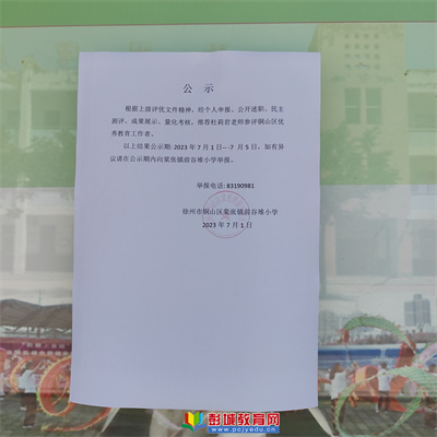 徐州教育:根據(jù)上級評優(yōu)文件精神,經(jīng)個人申報、公開述職、民主測評、成果展示、量化考核,推薦杜莉君老師參評銅山區(qū)優(yōu)秀教育工作者。以上結(jié)果公示期:2023年7月1日---7月5日,如有異議請在公示期