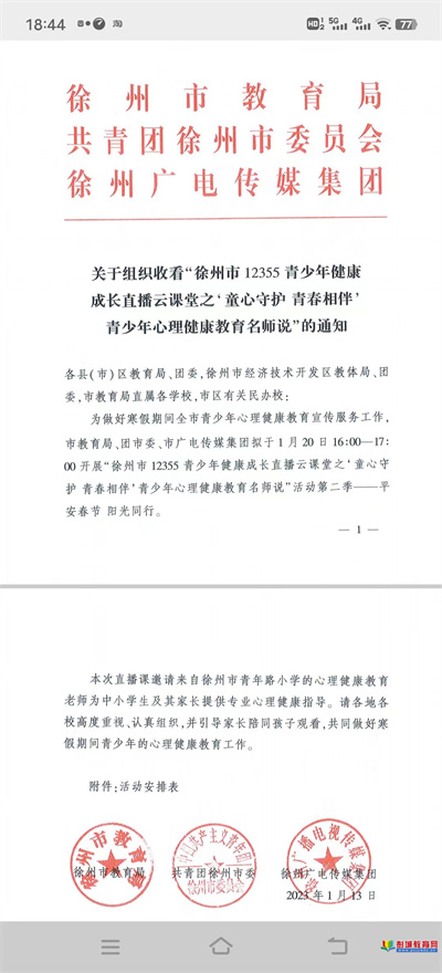 徐州教育:為做好寒假期間全市青少年心理健康教育宣傳服務工作,市教育局、團市委、市廣電傳媒集團擬于1月20日16:00-17:00開展"徐州市12355青少年健康成長直播云課堂之'童心守護青春相伴'青