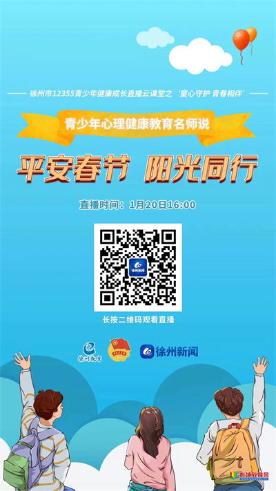 徐州教育:平安春節(jié),陽光同行。為做好寒假期間全市青少年心理健康教育宣傳服務工作,市教育局、團市委、市廣電傳媒集團于1月20日16:00-17:00開展“徐州市12355青少年健康成長直播云課堂之‘童心守