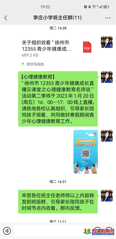 為做好春節(jié)期間學生們心理健康教育工作,房村鎮(zhèn)中心小學組織學校師生家長一起聚焦云端,收看“2023首場徐州市12355青少年健康成長直播云課堂之‘童心守護 青春相伴’青少年心理健康教育名師說”活動第二季--平安春節(jié) 陽光同行課堂,于1月20日16:00準時開講。