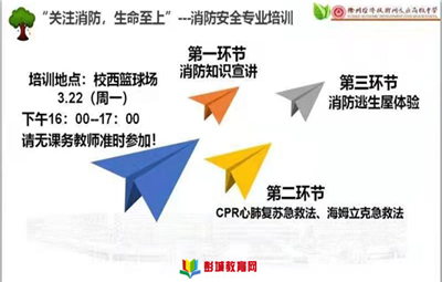 彭城教育:按照“全民參與防治火災(zāi)”全國消防宣傳月大培訓(xùn)、大演練要求,結(jié)合《社會消防安全教育培訓(xùn)規(guī)定》(公安部令第109號)、《關(guān)于加強和改進社會消防安全培訓(xùn)工作的意見》(公消〔2014〕