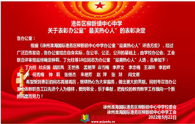 徐州教育:2022年5月22日,徐州淮海國際港務(wù)區(qū)柳新鎮(zhèn)中心中學(xué)舉行辦公室“最美熱心人”總結(jié)頒獎(jiǎng)活動。此次評選是學(xué)校組織的最美辦公室評選活動的延伸,旨在培育和踐行社會主義核心價(jià)值觀,深入