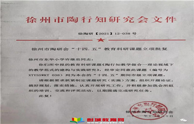 教育熱點:徐州市陶行知研究會【2021】12-038通知,徐州市東華小學(xué)申報的教育科研課題《陶行知教學(xué)做合一理論視域下的教學(xué)范式的建構(gòu)與實踐研究》,經(jīng)審定同意此課題(編號為XTYSSWKT038)列為徐州市