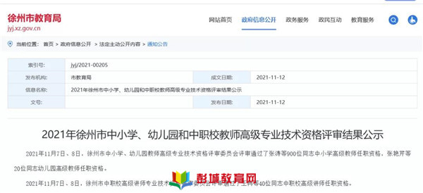 教育熱點:11月12日徐州市教育局網(wǎng)站發(fā)布2021年徐州市中小學、幼兒園和中職校教師高級專業(yè)技術(shù)資格評審結(jié)果公示有教過你的老師嗎?有你家娃的老師嗎?速來圍觀